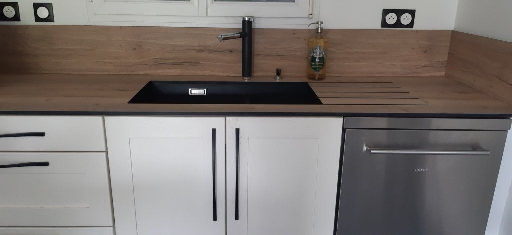 Cuisine sur mesure sous l'escalier, agrandissement de la mezzanine avec fabrication de l'escalier, table escamotable:
