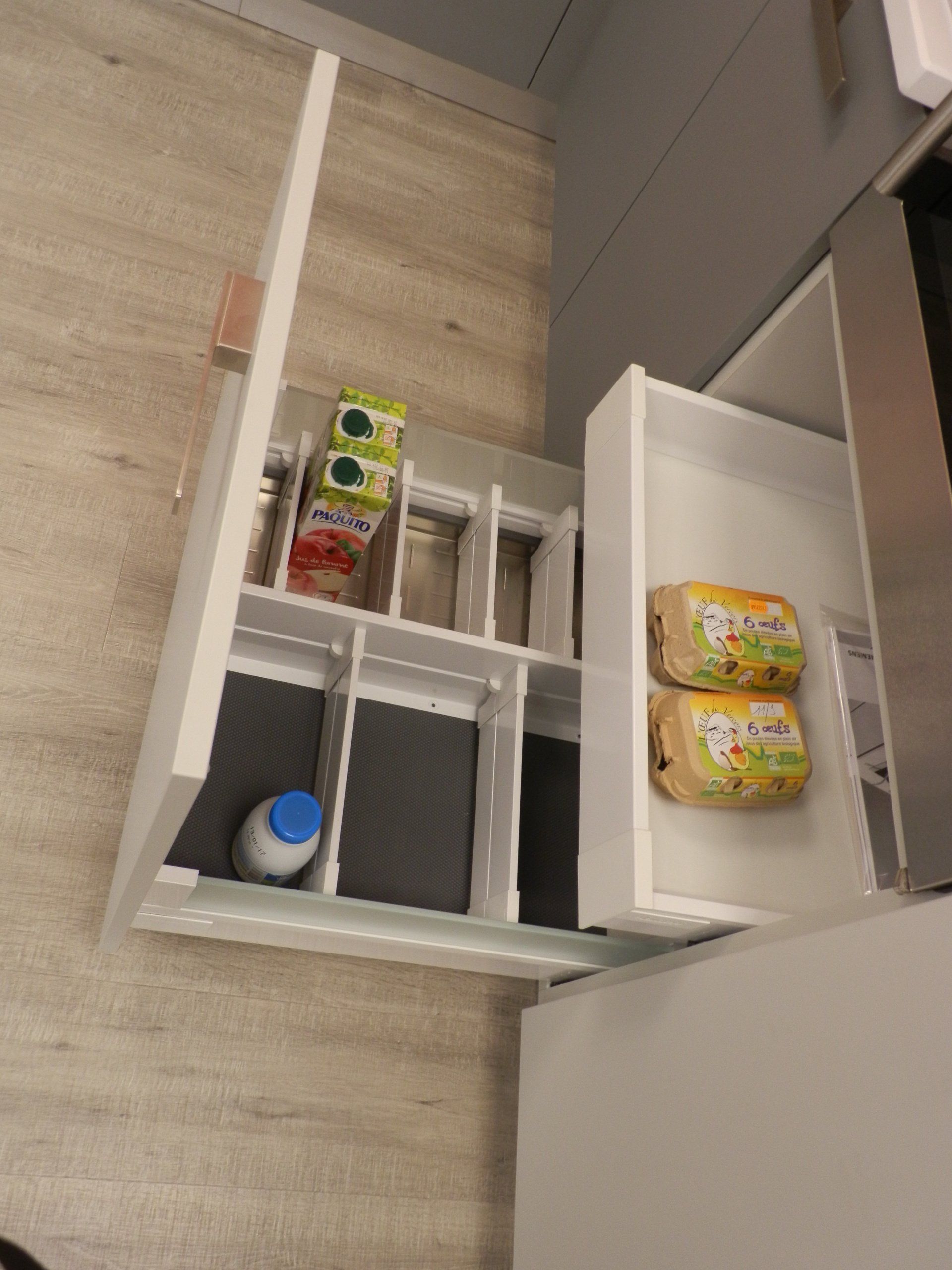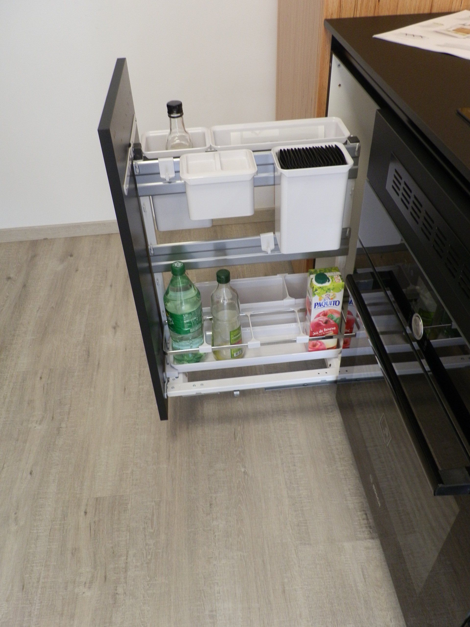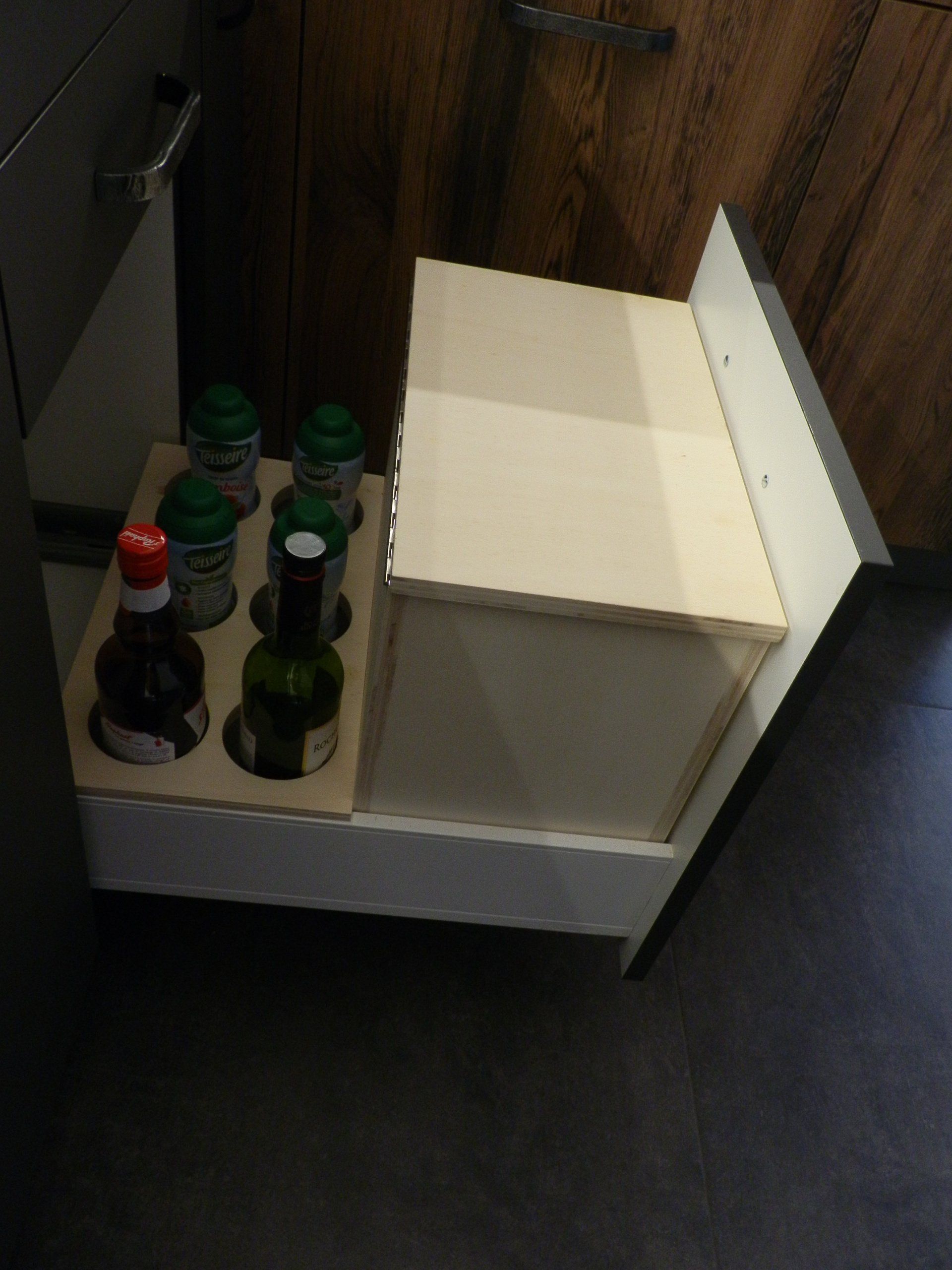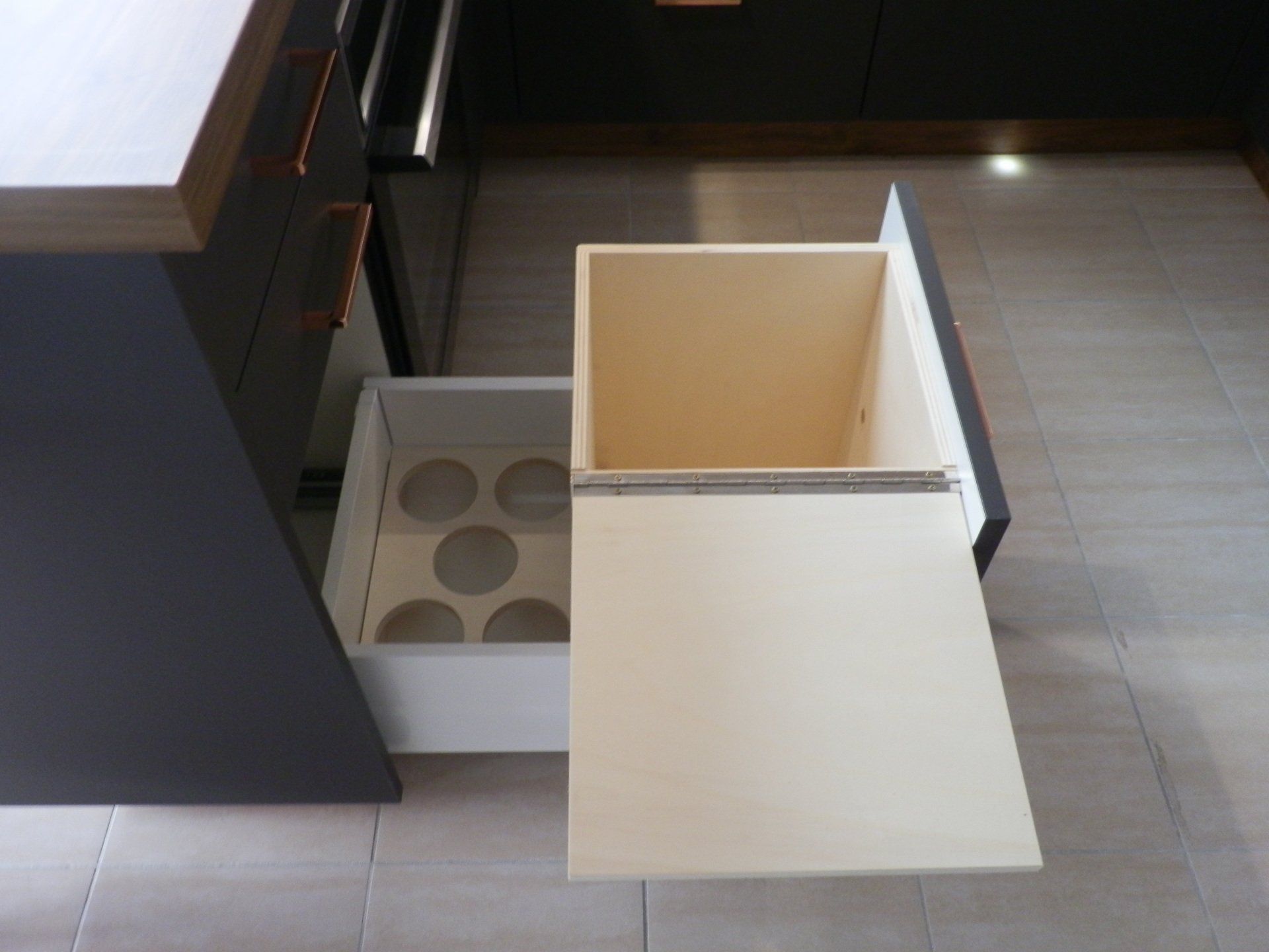 Tiroirs de rangement avec casiers à bouteilles et coffre à pain.