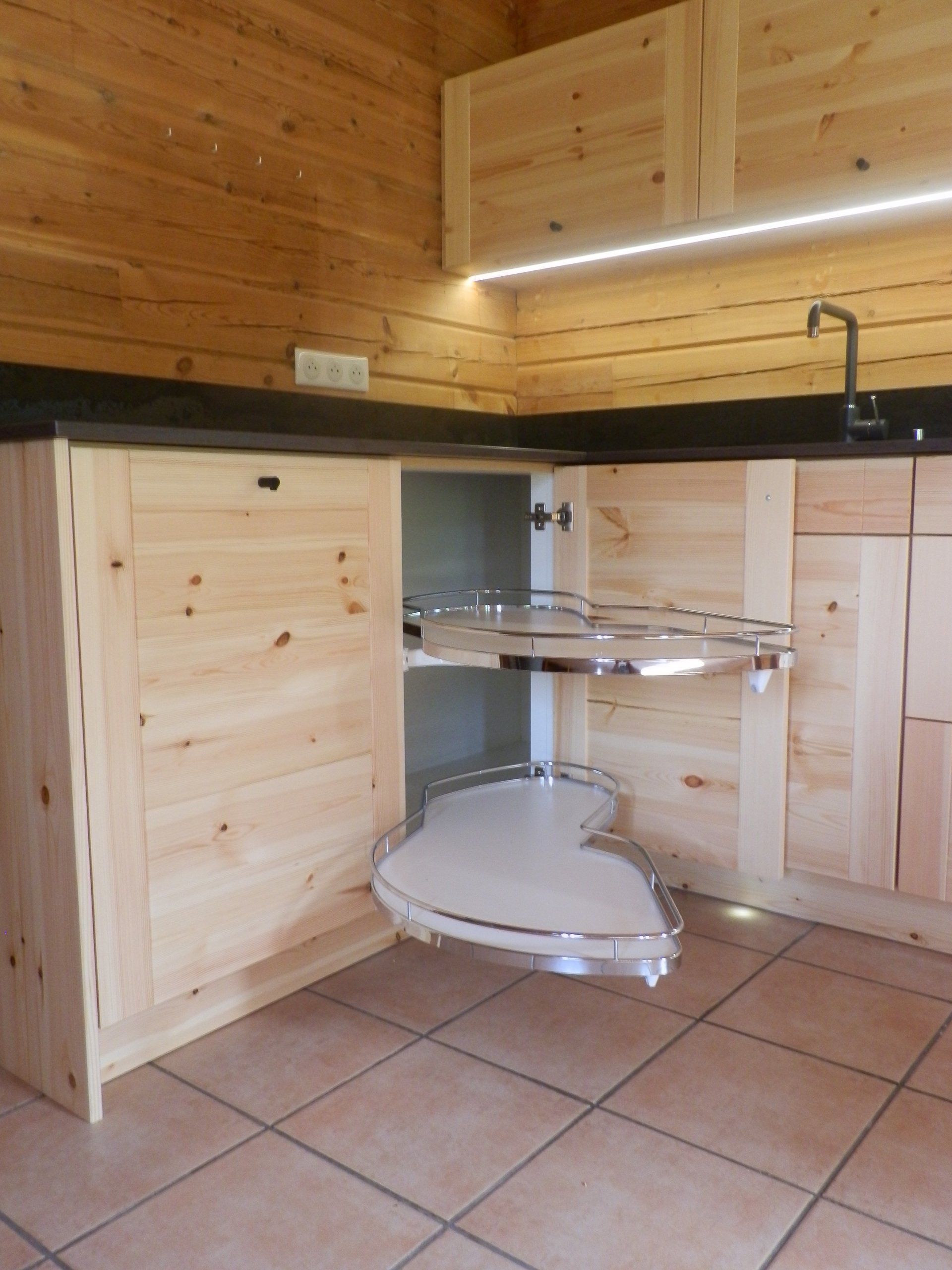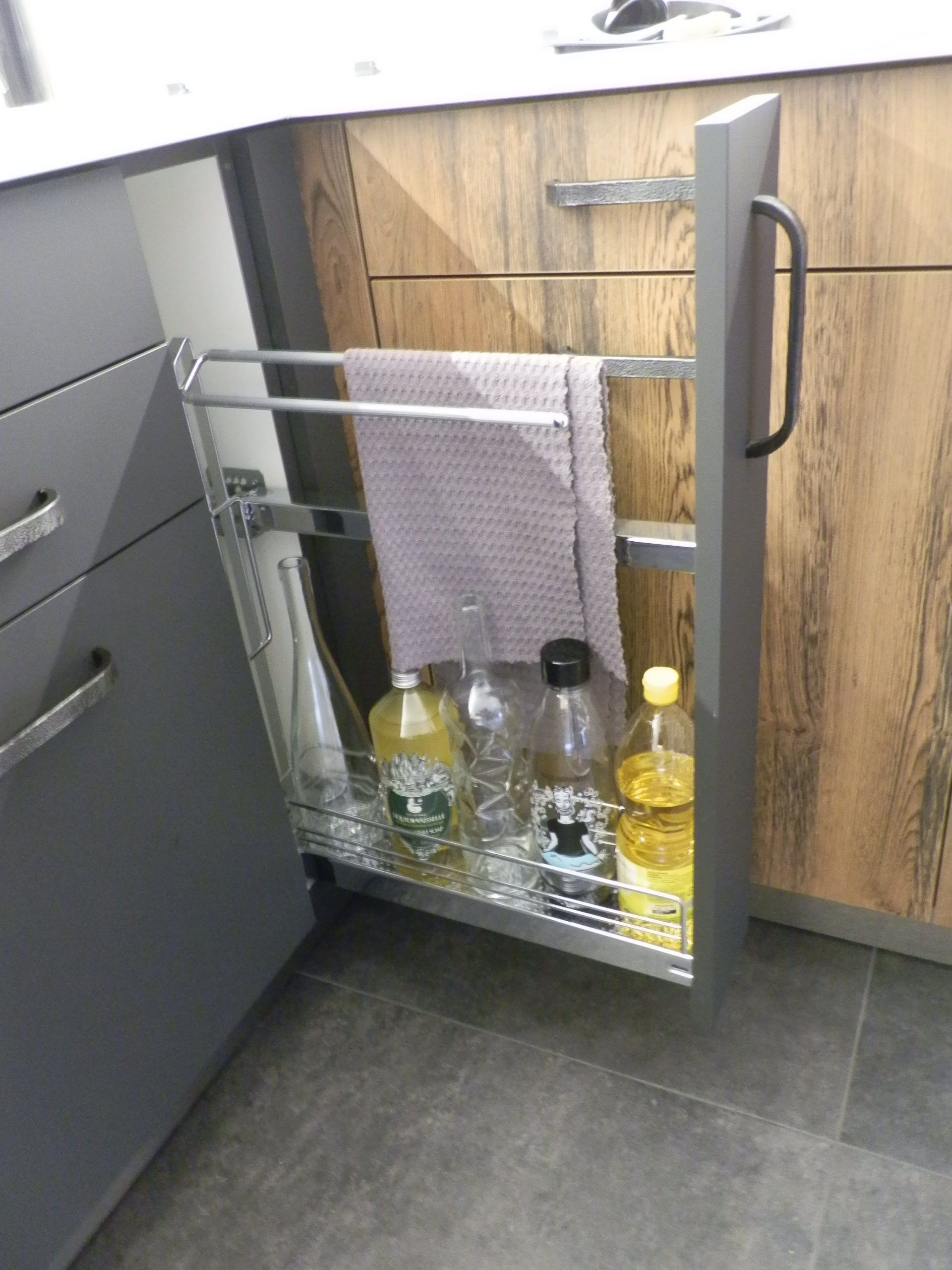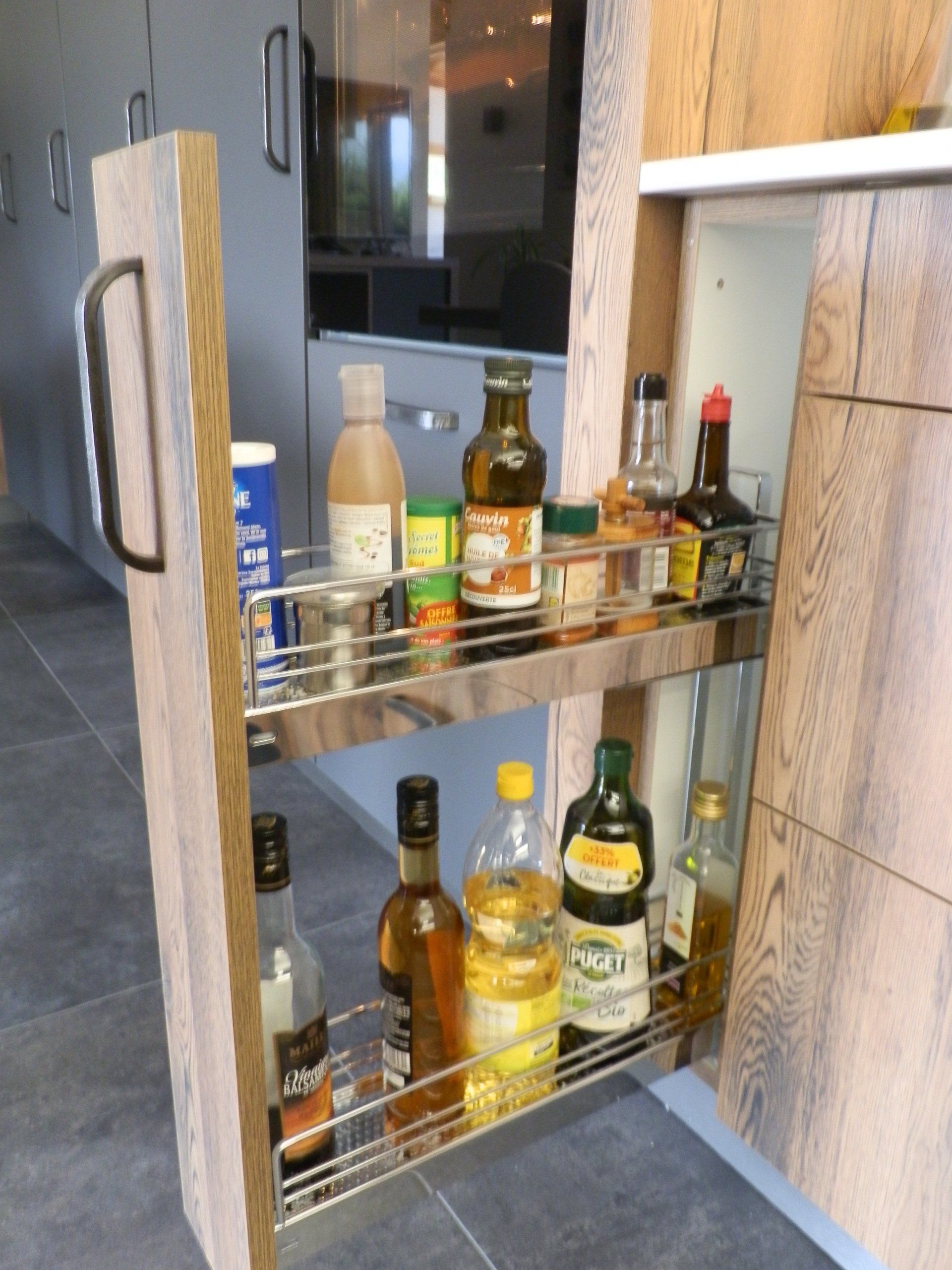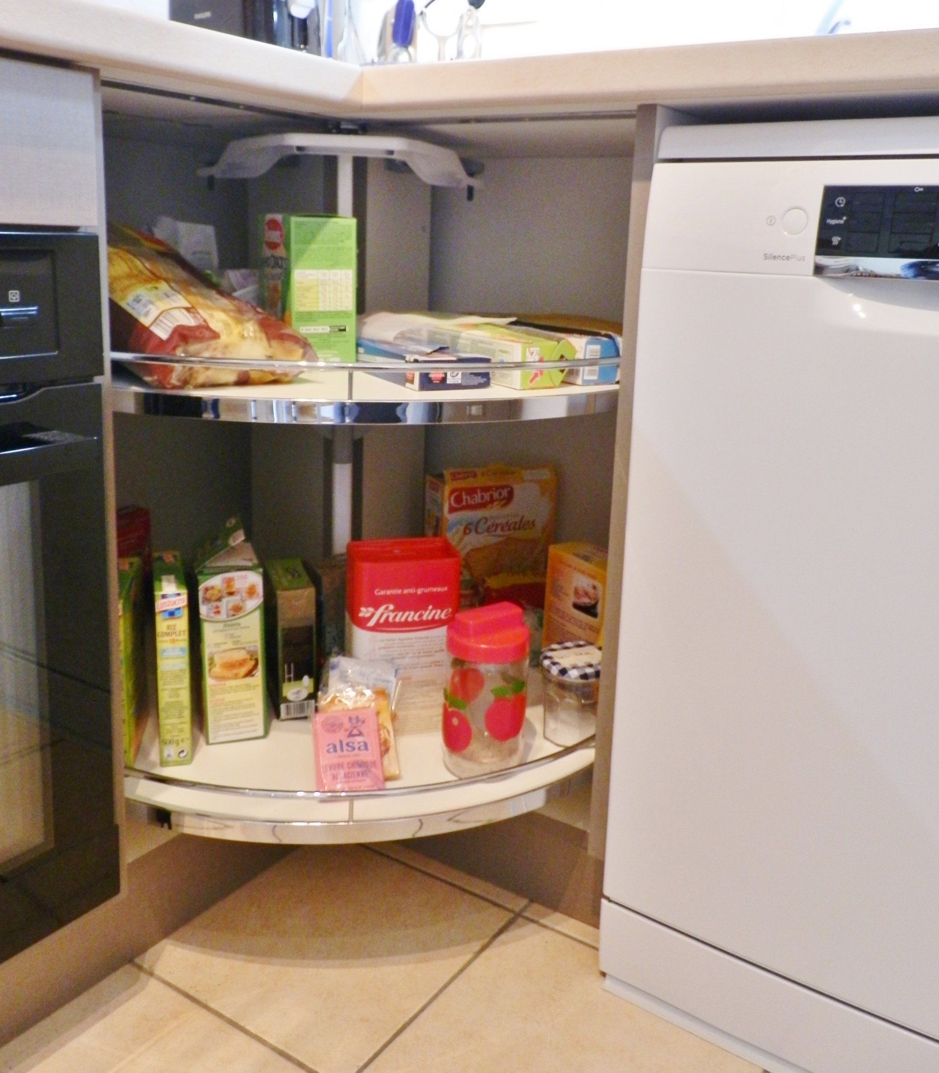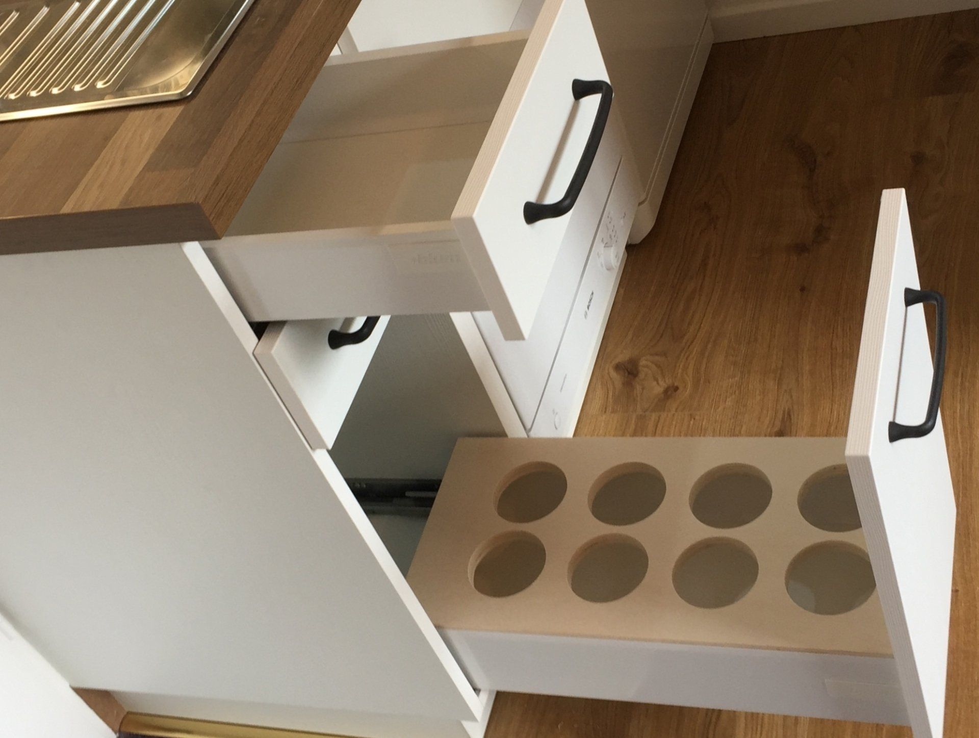 Tiroirs de rangement avec casiers à bouteilles et coffre à pain.