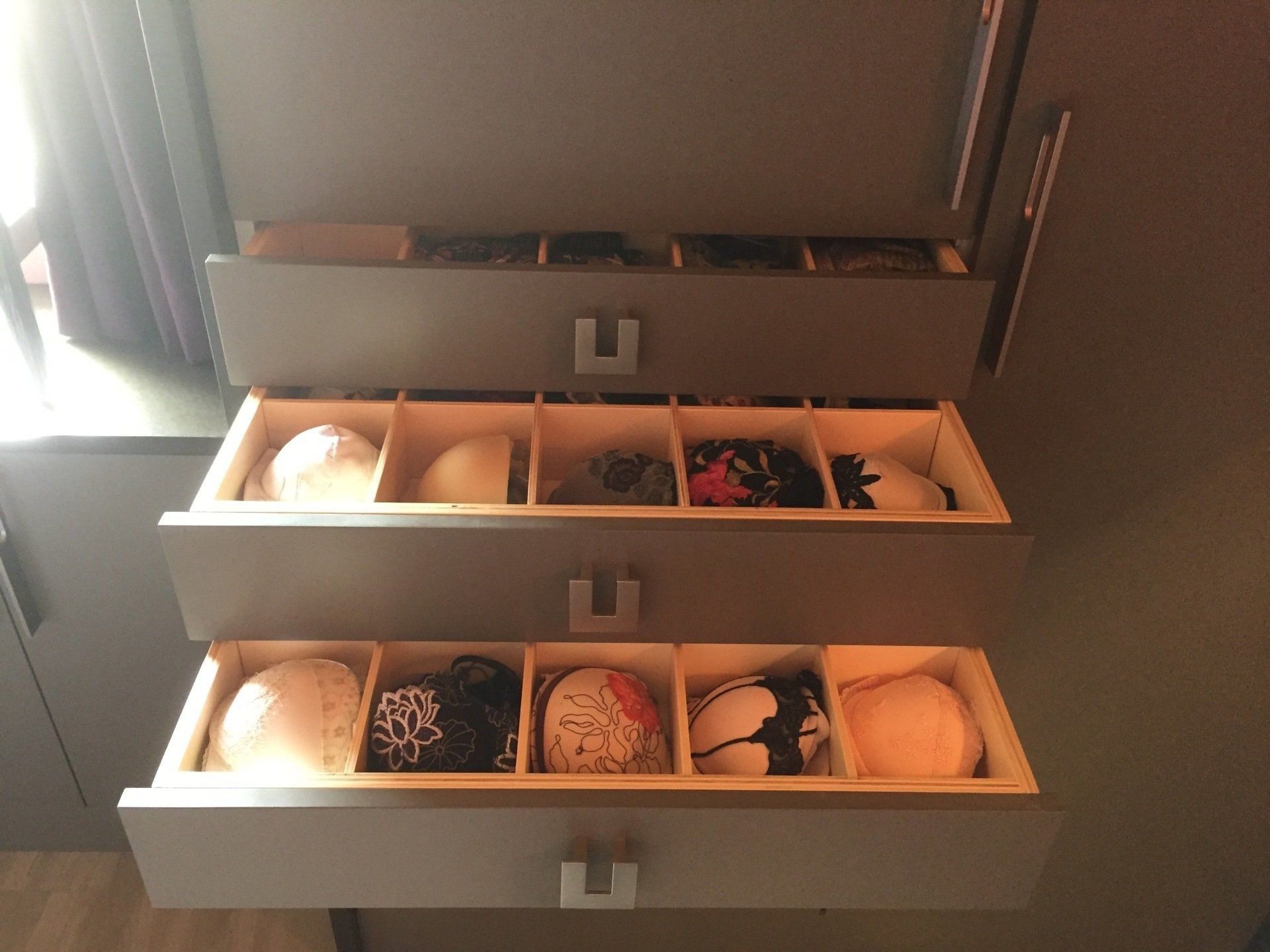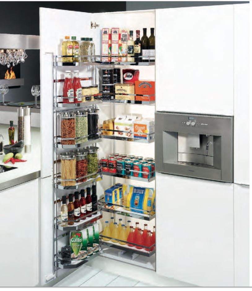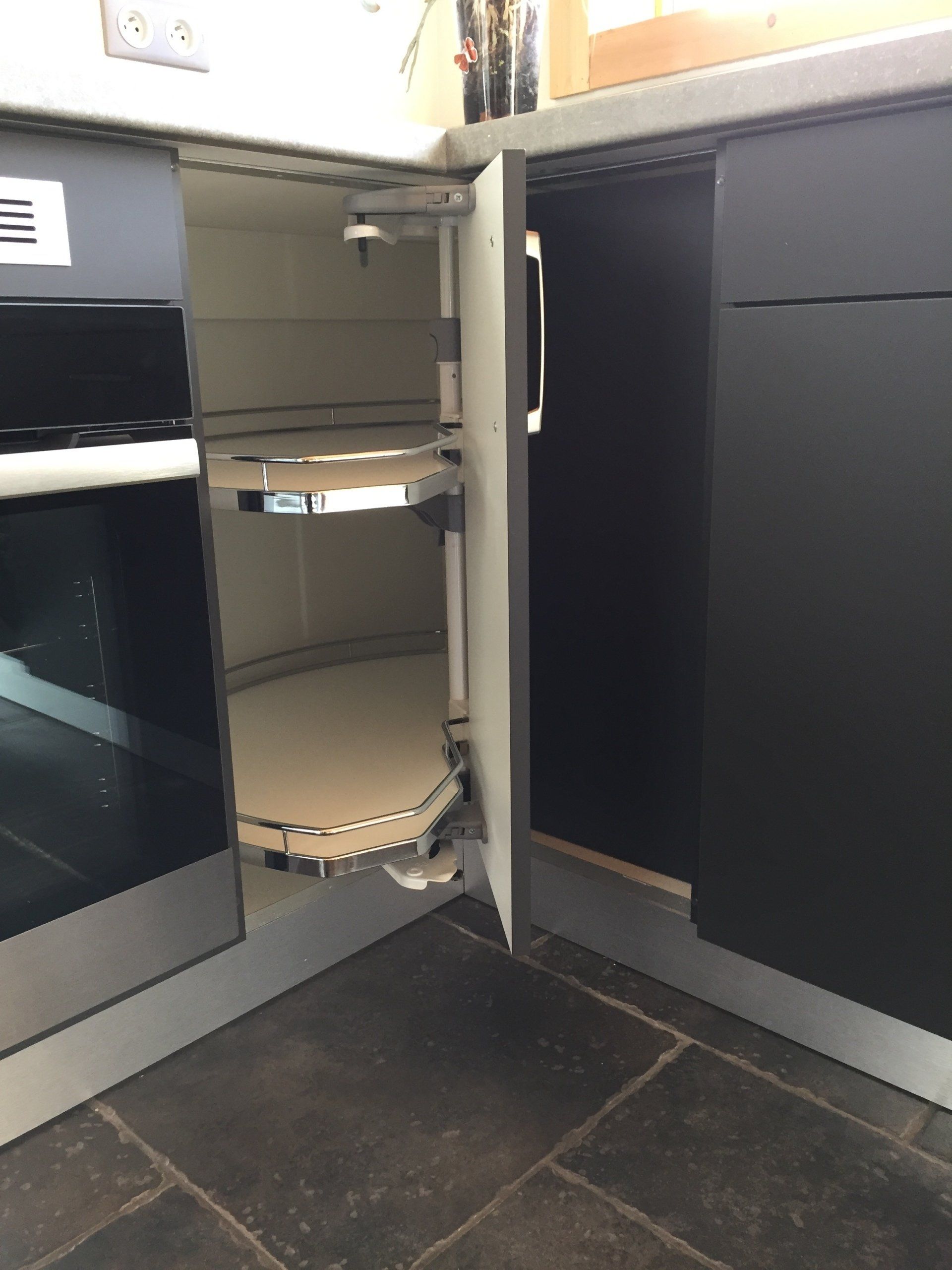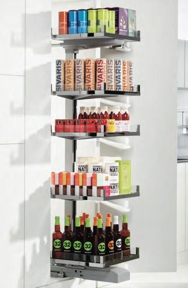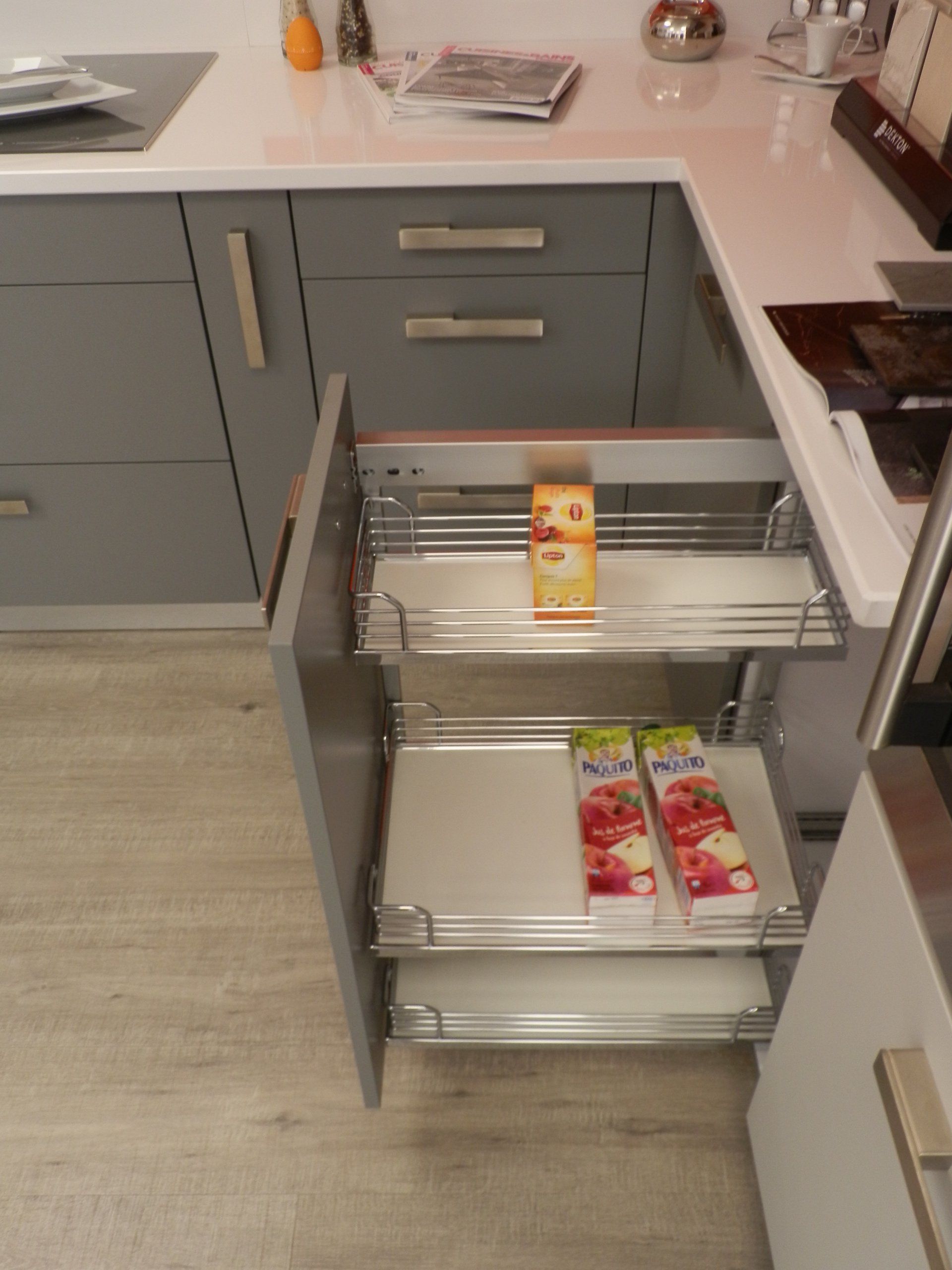 Tiroirs de rangement avec casiers à bouteilles et coffre à pain.