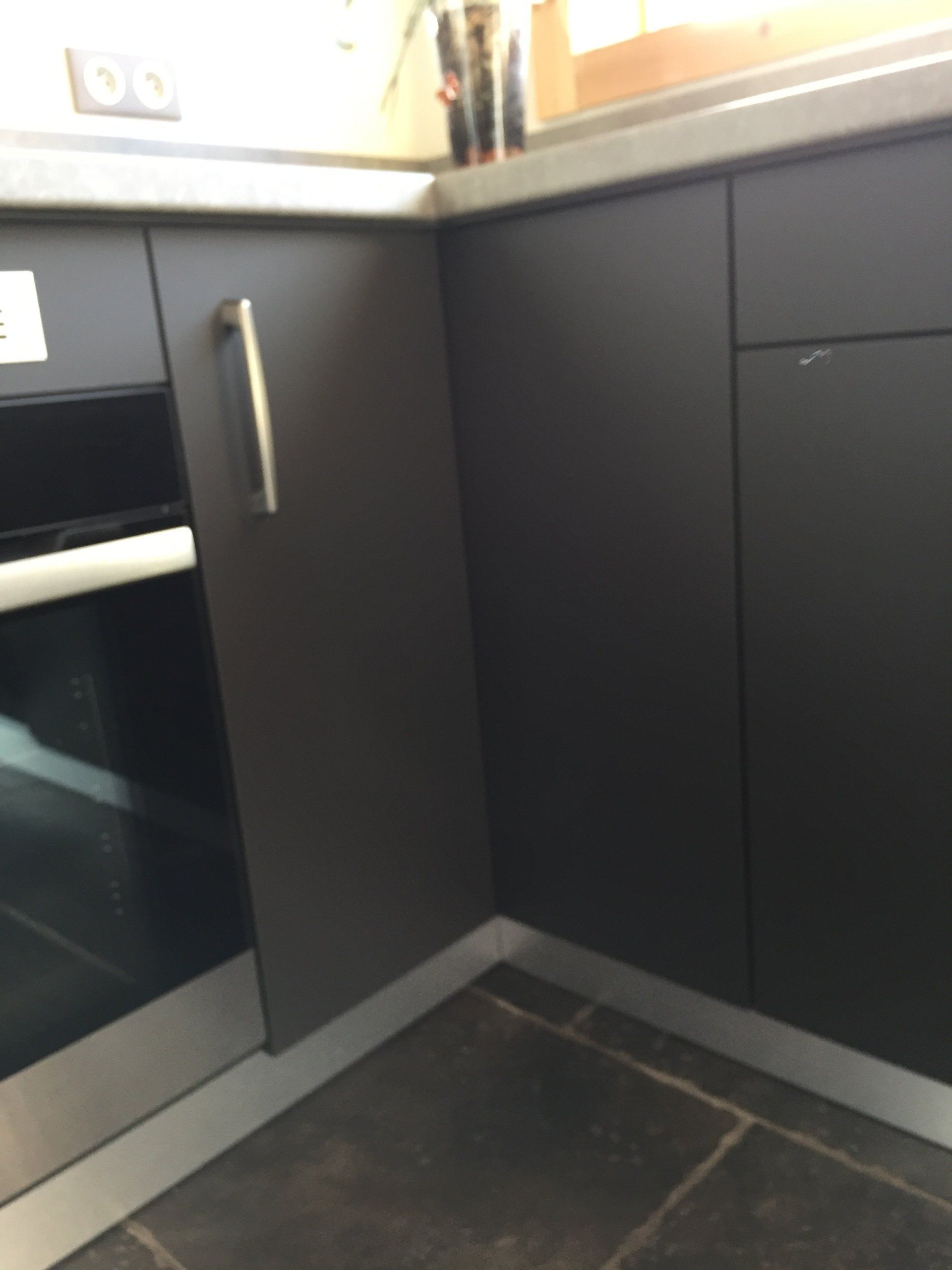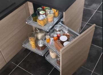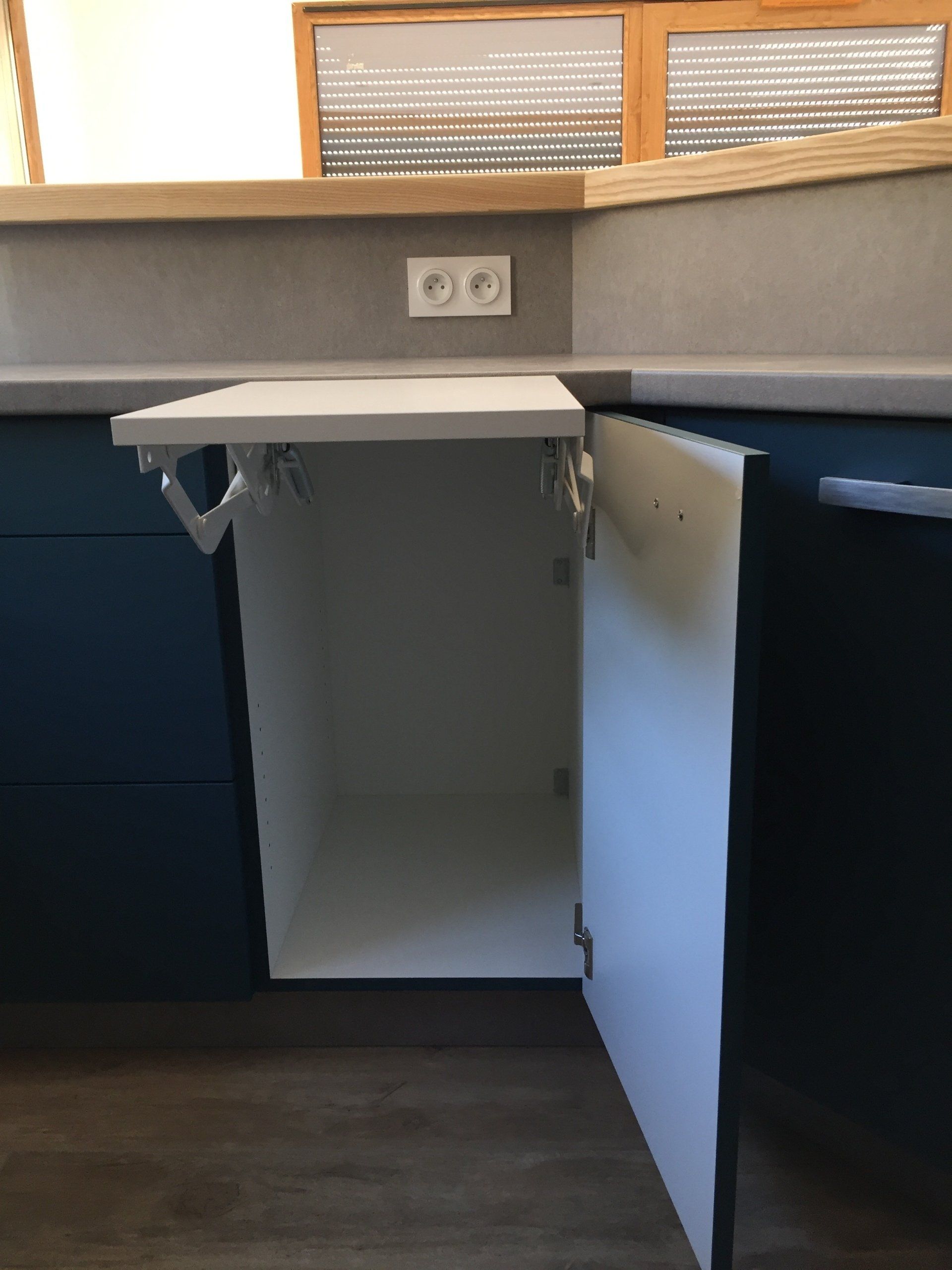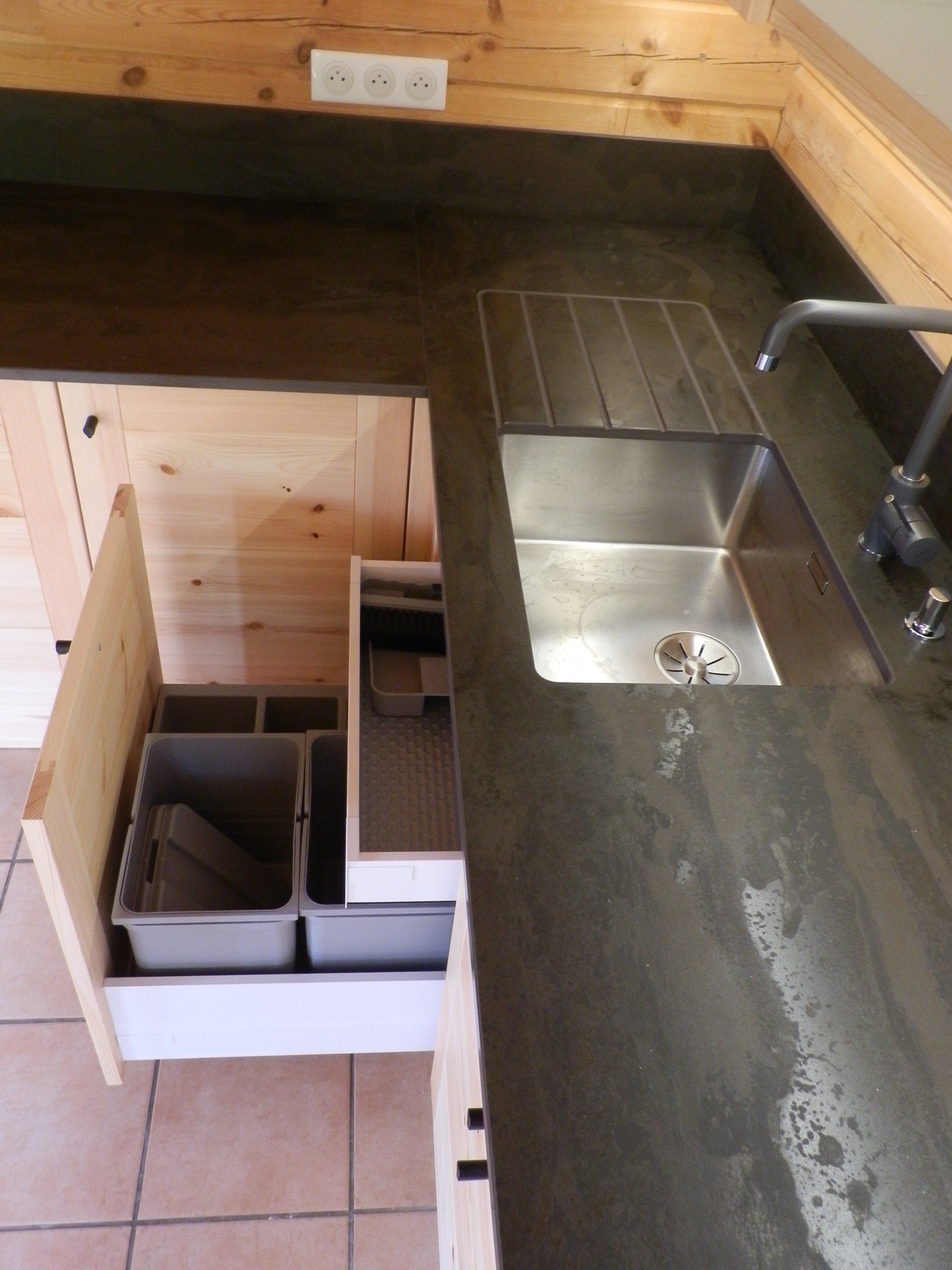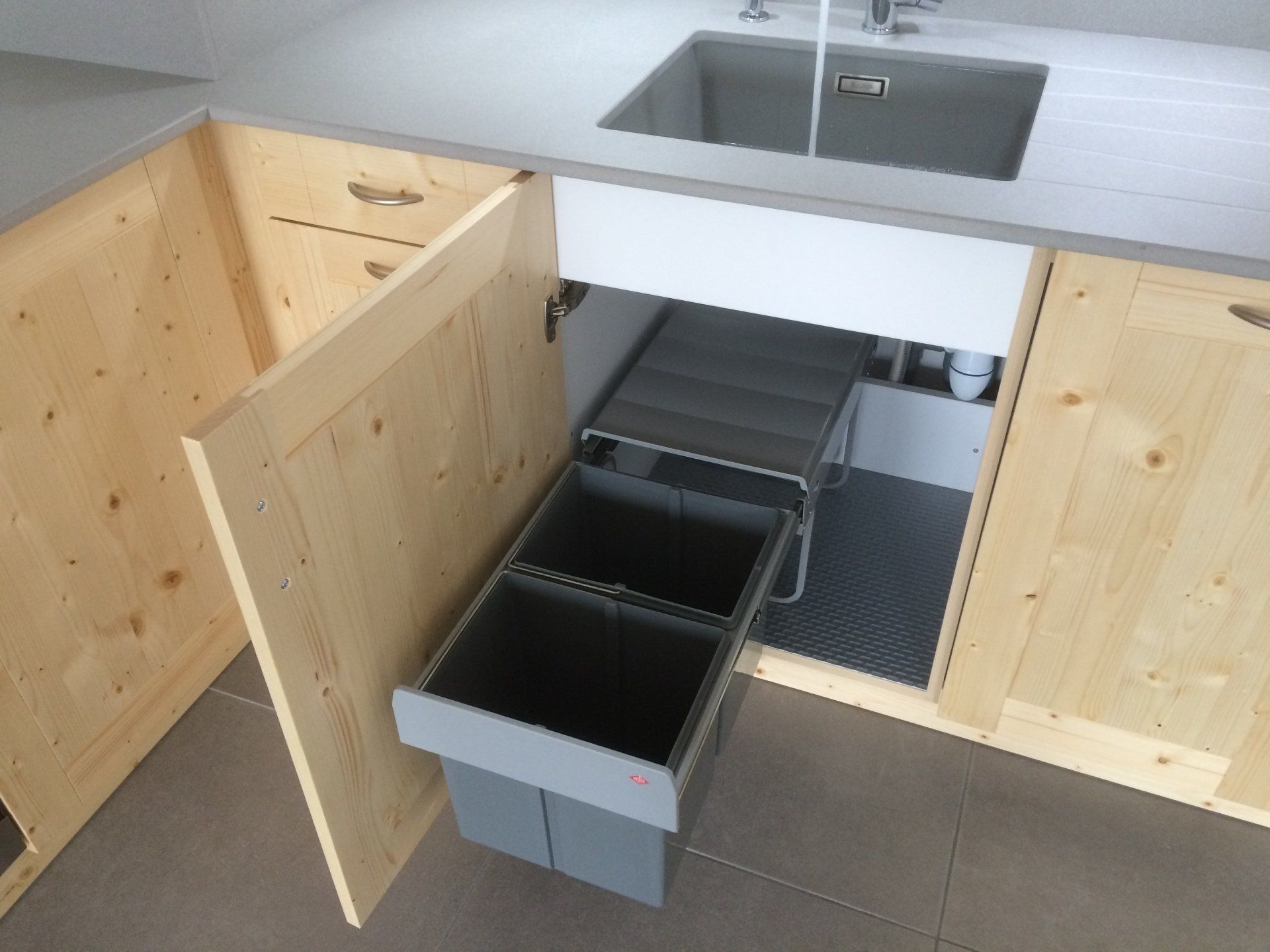 Façade coulissante avec 2 poubelles de 15 litres, rangement pour les produits ménager ainsi qu'un tiroir à l'anglaise avec une protection en pvc pour les éponges.