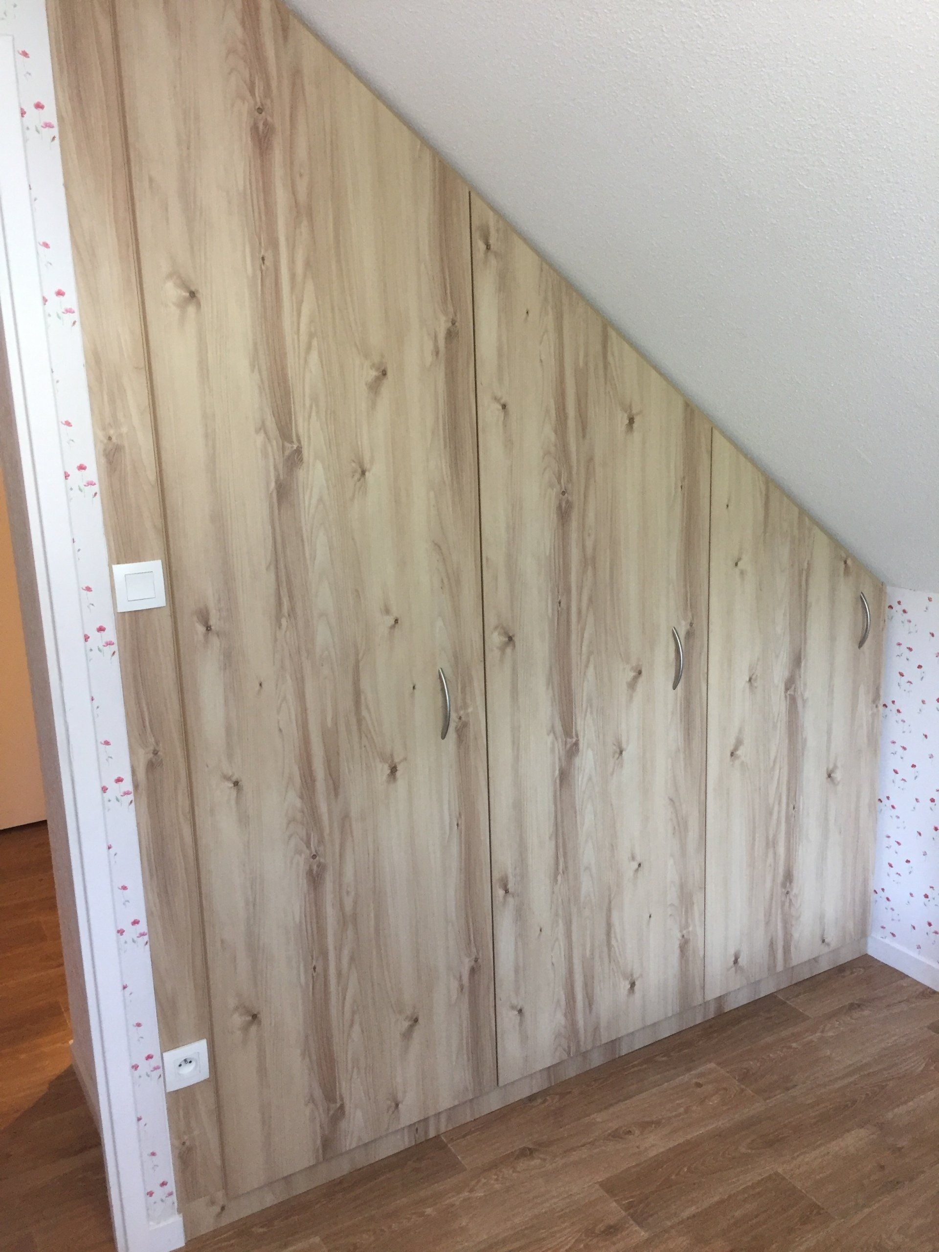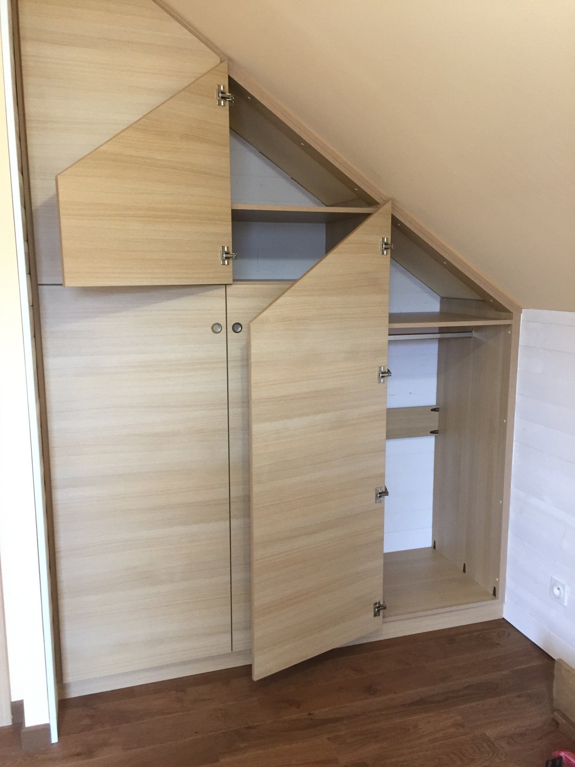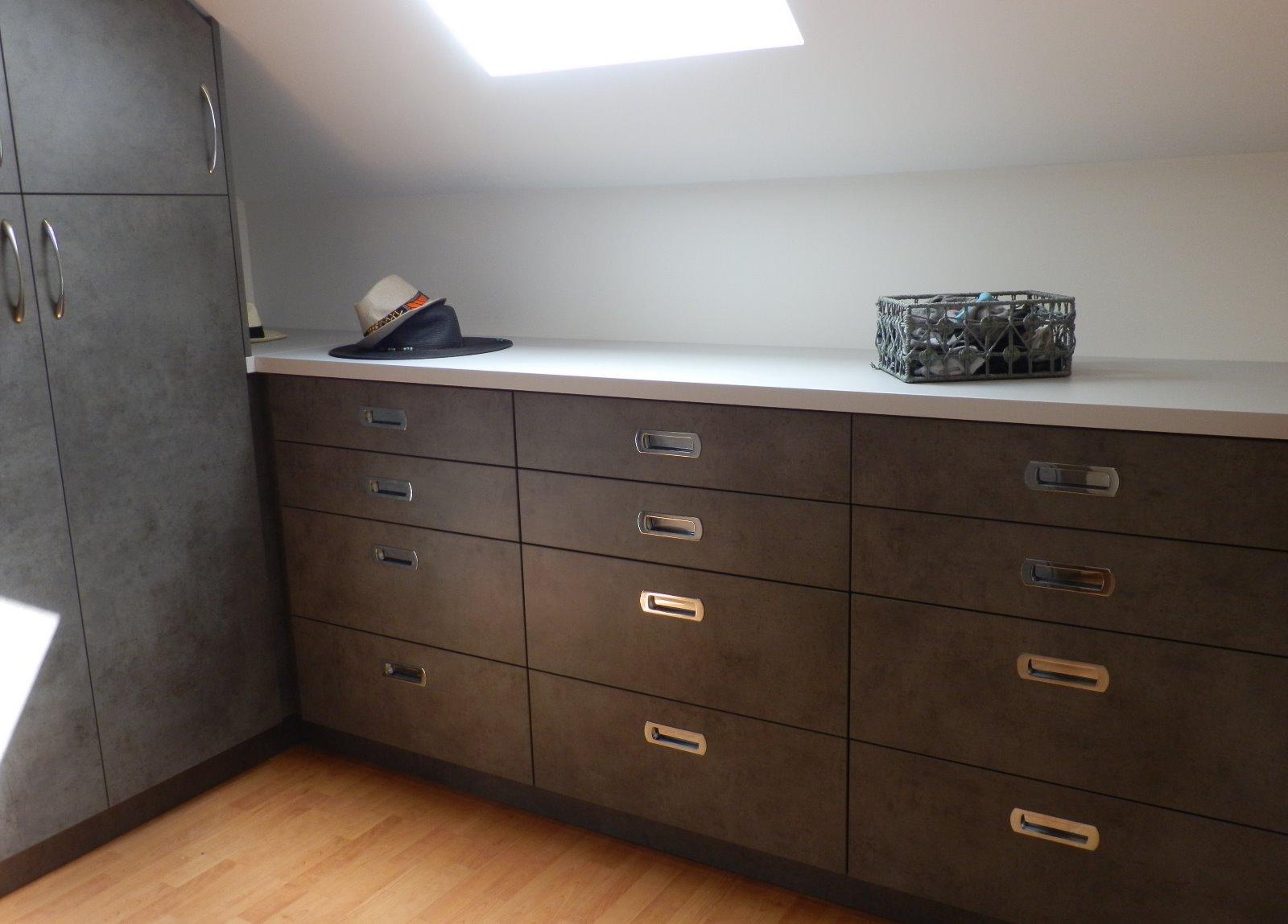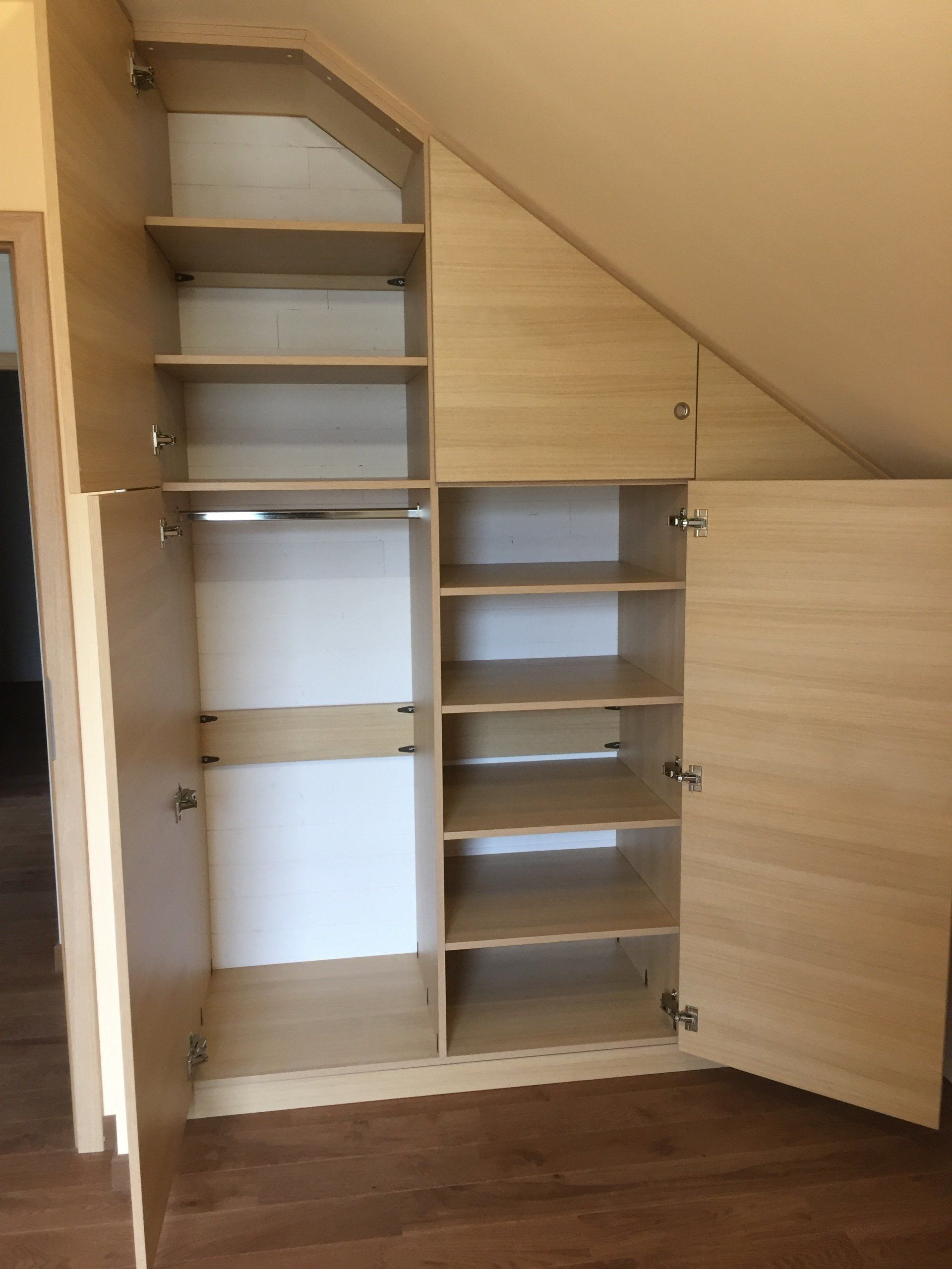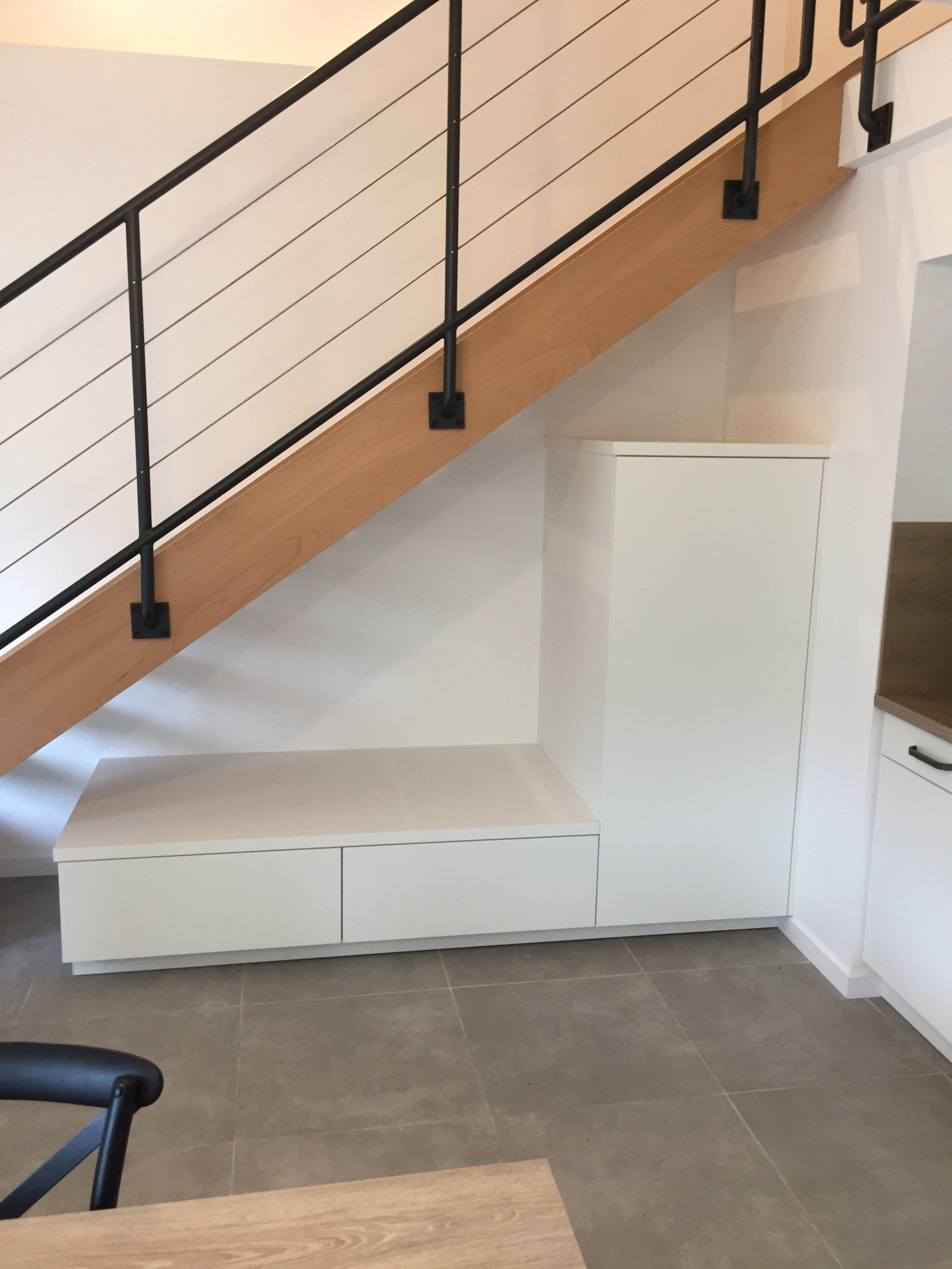 Aménagement sous escalier avec 1 colonne penderie et un coffre à chaussures.